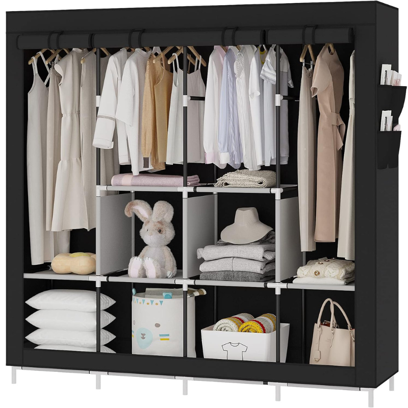 - Amplio Espacio de Almacenamiento: Dividido en secciones funcionales que incluyen estanterías, una sección de suspensión y bolsillos laterales. Este armario portátil ofrece amplio espacio para almacenar ropa, zapatos, accesorios y más, manteniéndolos siempre organizados y accesibles.